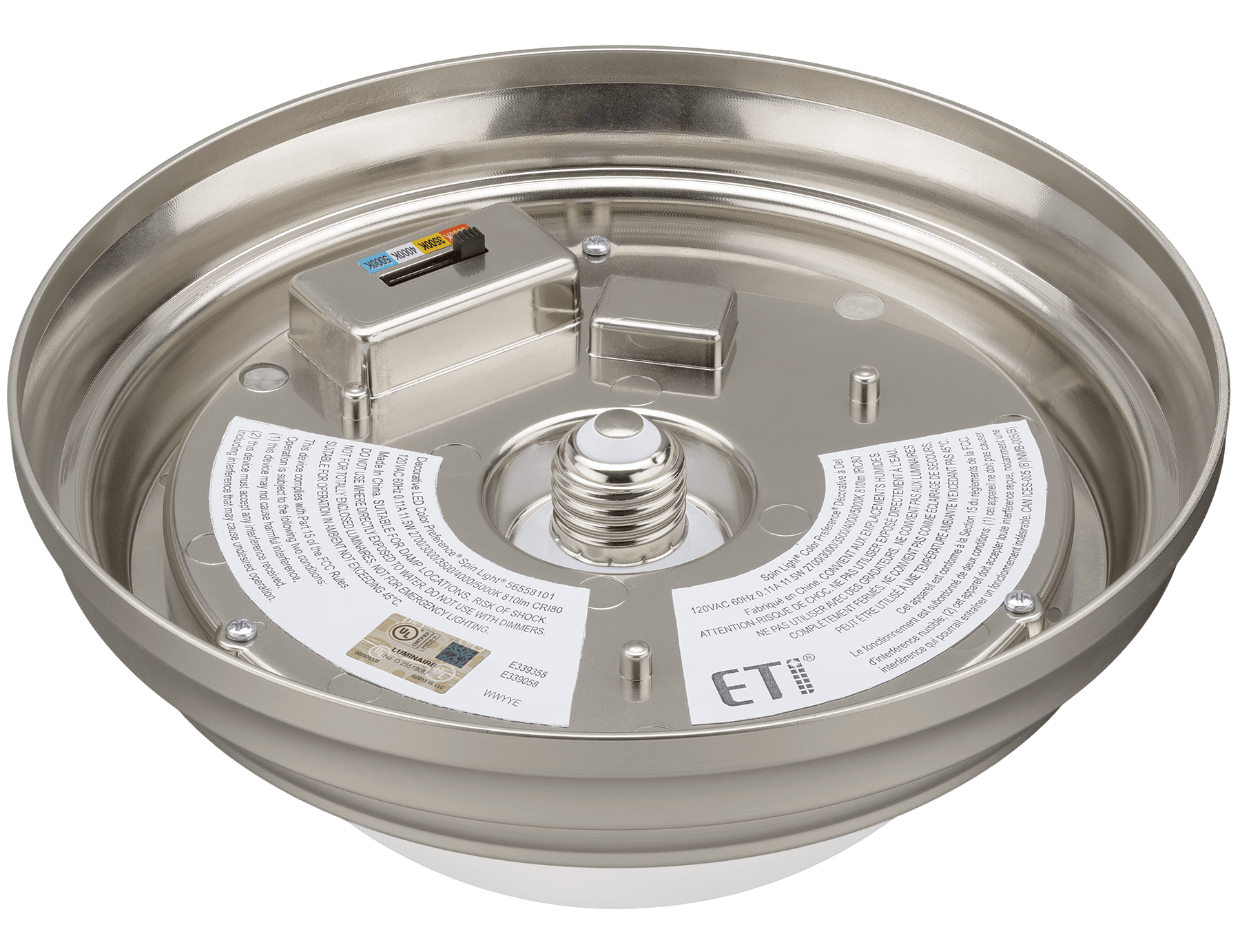 The 9″ Decorative Spin Light® features a brushed nickel finish and ETi’s patented COLOR PREFERENCE® technology with choice of five user-selectable CCT choices: 2700K, 3000K, 3500K, 4000K, or 5000K. The 810 lumen Spin Light® is equivalent to a 60w incandescent area light.
