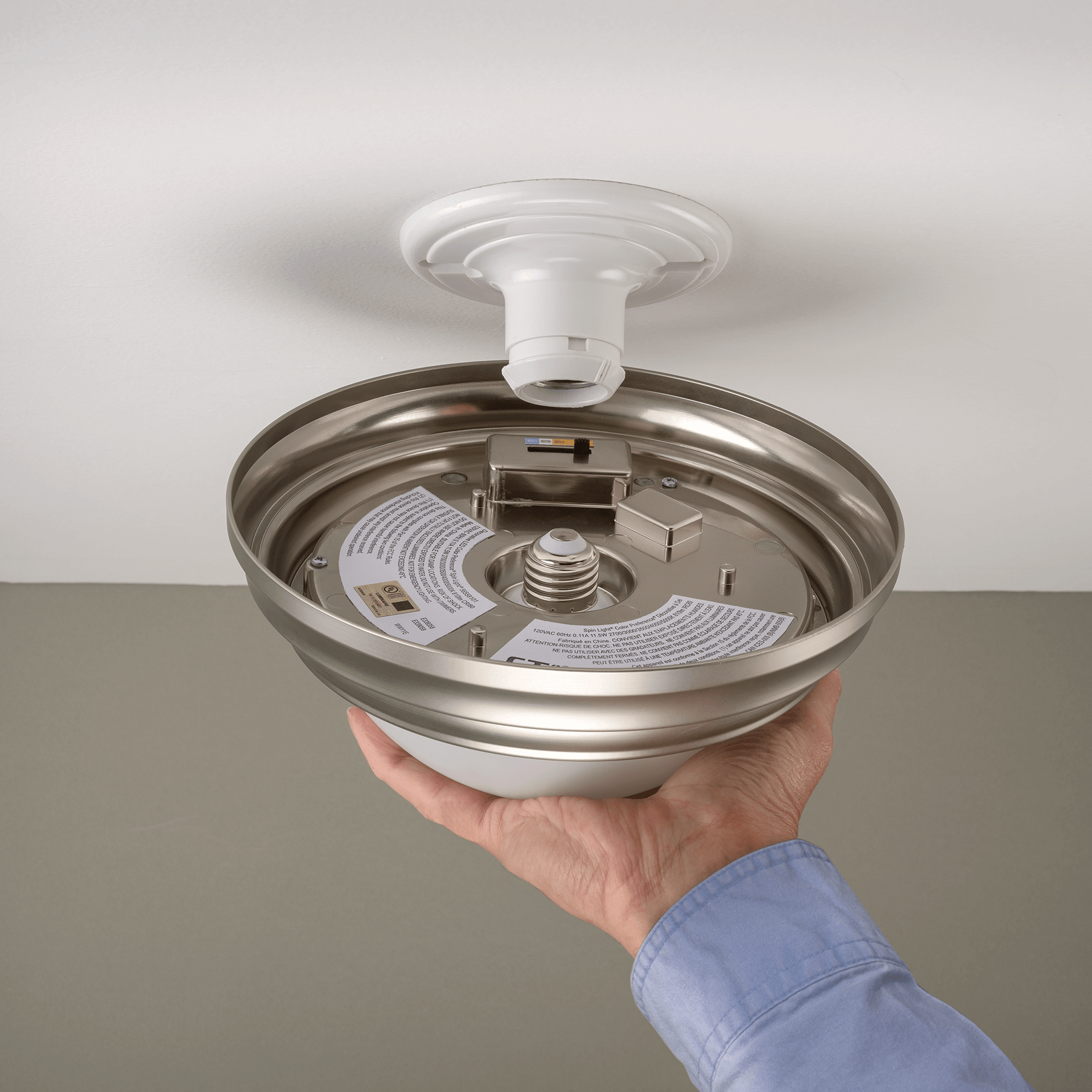 The patented Spin Light® converts a bare lamp holder into a bright LED flushmount ceiling fixture. Eliminates need to rewire and install new light fixture, the Spin Light® converts existing lamp holder by simply screwing onto existing lamp holder just light a light bulb! Also includes a SPEEDMOUNT® bracket for remodel and new construction installations that will convert a junction box into a lamp holder.
